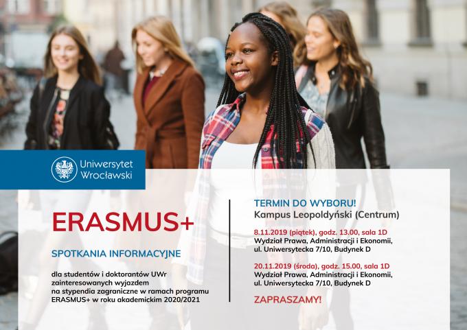 Studentów i doktorantów UWr zainteresowanych wyjazdem na stypendia zagraniczne w ramach programu ERASMUS+ w roku akademickim 2020/2021 zapraszamy na jedno ze spotkań organizacyjnych, które odbędą się w piątek 8.11.2019 o godz. 13:00 i w środę 20.11.2019 o godz. 15:00 na Wydziale Prawa, Administracji i Ekonomii, ul. Uniwersytecka 7/10 w Budynku D, sala 1D.